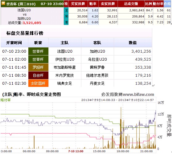 从标盘交易量排行榜可以看出必发市场上这场世青杯成交量达到300万以上,可谓独领风骚。而主队法国的成交显得相对平平淡淡,单笔成交量最高仅仅15万左右,无明显大资金介入的迹