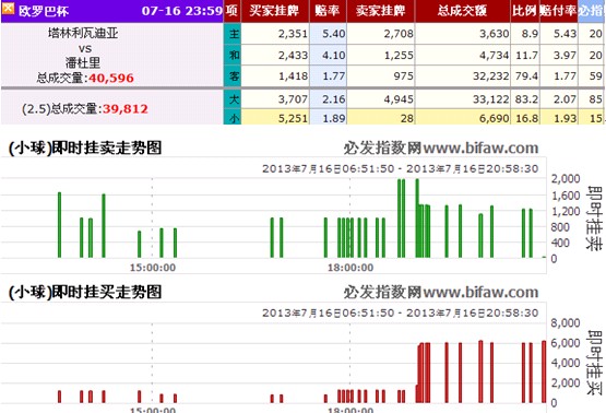这场欧霸杯赛事的大小球成交量基本与标盘成交量持平,值得关注。从成交比例来看,大球成交比例83%,明显偏高,并且大球欧赔并未下降,可见买方主动性并不强。而小球虽然成交比例较小,但交易量中最大的一笔是买入。其它小单都太小不值得考虑。小球的挂买强于挂卖,是相对有利的一面。