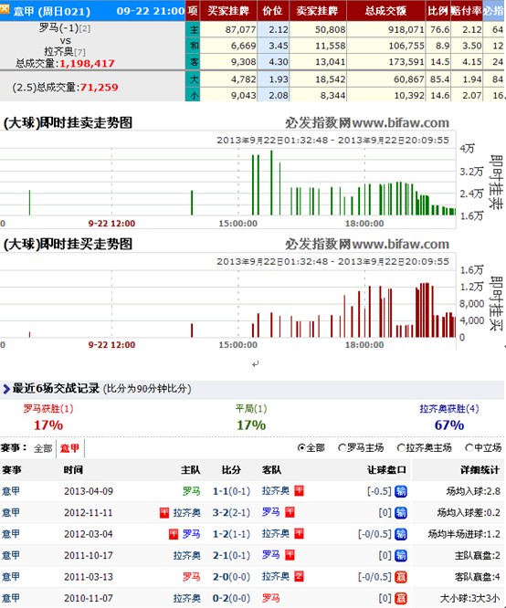 这场意甲赛事大小球成交量7万,大球成交比例占明显优势,达到85%。主流公司盘与水都相对稳定,2.5球中水。必发大球挂卖单明显强于大球挂买。两队交锋近六场均入2.8球,这样的盘口与水位对大球较为便宜。从必发成交比例来判断,有诱大的嫌疑。