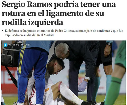 拉莫斯在世预赛对阵阿尔巴尼亚的比赛中不幸重伤,皇马官方表示西班牙中卫是左膝内侧副韧带二级扭伤,西媒起初预计将休战4到6周。但《世界体育报》则公布了另一则重磅消息:拉莫斯可能是左膝内侧副韧带撕裂,如果是这种伤病的话,2016年直接报销。