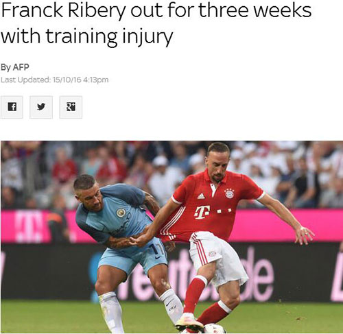 拜仁助理教练赫尔曼-格兰德接受《天空体育》采访时说道:“里贝里需要至少二到三周的时间方能重新回到球场。”在拜仁客场挑战法兰克福的比赛中,里贝里留在了慕尼黑治疗腿部伤病。除了无缘周中的欧冠赛事之外,里贝里也无法赶上拜仁主场对阵门兴以及客场挑战奥格斯堡的德甲比赛,而南部之星坐阵主场迎战奥格斯堡的德国杯第2轮的较量,里贝里也将缺阵。