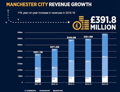 去年10月,曼城曾公布2014/15赛季财报,这是曼苏尔入主球队后首次实现盈利。时隔一年,蓝月亮再度对外公布球队财政情况,可喜的是,英超豪门又一次实现了盈利!根据财报内容显示,曼城全年营业收入达到创纪录的3.92亿英镑,盈利额达到2050万英镑,俱乐部继续保持着零债务运营。