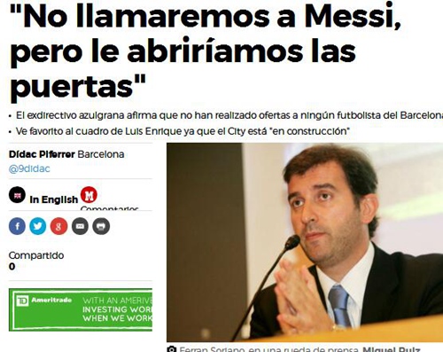 《太阳报》曾经披露,瓜迪奥拉试图在今年夏天招揽梅西,但是在对阵巴萨的赛前新闻发布会上,瓜帅已经对此进行了否认,而索里亚诺对此说道,“正常情况下,梅西会在巴萨结束他的职业生涯,我们不会主动联系他,但是如果某一天他联系了我们,那么曼城的大门也会向他敞开。他是世界最佳,他才是那个决定自己在哪里结束职业生涯的人。”