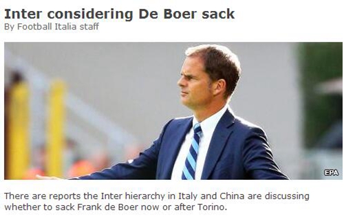 意大利媒体《转会市场》爆料,在国际米兰输给亚特兰大之后,在本土的俱乐部管理层与苏宁集团进行电话会议,商讨的内容便是德波尔的去留,目前荷兰人到了随时都有可能被炒掉的处境。另一家意媒《天空体育》披露,德波尔的帅位还暂时安稳,至少在下一轮踢都灵之前,肯定不会被解雇。该媒体称,下周中意甲联赛迎来第10轮角逐,国际米兰主场面对都灵,这场如果再输的话,德波尔铁定下课。其实,德波尔也觉得自己可能被炒掉,混合区接受采访时,直言自己不清楚还能否带队出战都灵的比赛。当然,由于带队成绩相当糟糕,解雇德波尔简直民意所归,球迷都希望换帅。