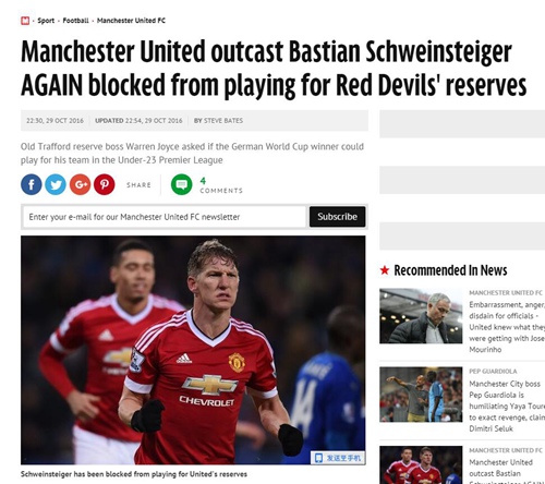 据悉,过去两周,曼联预备队主教练沃伦-乔伊斯(Warren Joyce)一直在向主帅穆里尼奥询问,被一线队废黜的施魏因施泰格能否代表预备队参加比赛。但乔伊斯最终被告知,周薪高达17万英镑的德国球星不允许代表曼联参加任何级别的比赛,哪怕是U23(预备队)的联赛。他只能随队进行训练。在该报看来,曼联主帅穆里尼奥和世界级球星施魏因施泰格之间的矛盾将无休止下去……最快也要等到明年1月份,待冬季转会窗口开启时,可能才有可能以小猪的离队而告终。