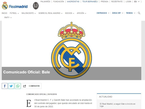 西班牙当地时间10月30日下午,皇家马德里俱乐部官方宣布:同队内锋线绝对主力贝尔续约到2022年。不过皇马官网并没有透露具体的续约细节,西媒普遍猜测贝尔的年薪将会上涨,在队内仅次于C罗,位列第二位。违约金五亿欧元。当地时间10月31日下午13点30分,贝尔将在伯纳乌的新闻厅出席发布会。