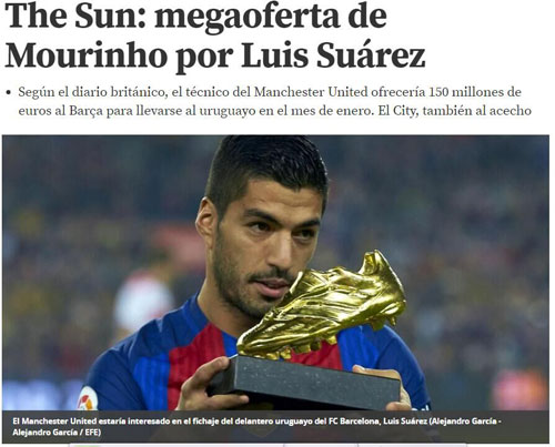 曼联今夏以1.05亿欧元签下了博格巴,但是穆里尼奥带队的成绩并不稳定,如今狂人则是认为球队锋线存在问题,仅仅依靠伊布1人远远不够。最直接粗暴的方式就是签下一位正值巅峰期的中锋,《太阳报》则表示:曼联打算明年1月以1.5亿欧元的身价签约苏亚雷斯。