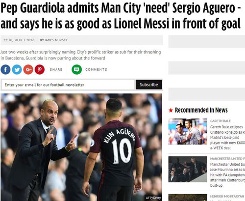 在曼城4-0大胜西布朗维奇后,瓜迪奥拉接受采访时算是对阿圭罗的离队传闻做出辟谣,称阿根廷前锋就是蓝月亮的梅西。“比赛结束后,我对阿圭罗说,‘谢谢你。’我们绝对需要他,没有他的话,我们绝对无法完成赛季初制定的目标,绝对不能。”瓜迪奥拉赞美阿圭罗,“在禁区里,他就如同梅西,我必须要说一点,他还可以变得更好,我们都需要他,他也非常拼命。这无关他进了多少球,只要他进球,我们就非常开心,我跟他说,你必须感受到自己之于球队的重要性。当阿圭罗开心的时候,球队同样开心。当你感觉不错的时候,整支球队都变得不一样了。”