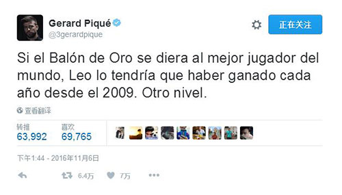 近日,皮克在个人推特上写道:“如果金球奖是颁发给世界上最好的球员的话,那么自2009年开始,莱奥应该每一年都获奖,他是属于另一个领域的球员。”