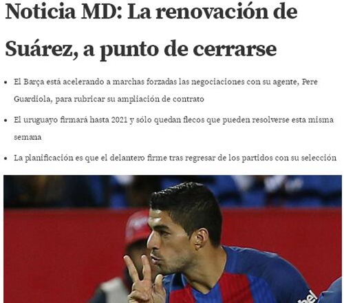 北京时间11月8日,西班牙《世界体育报》消息,西甲豪门巴萨接近续约乌拉圭前锋苏亚雷斯,双方的新合同有望延长至2021年,而在本月的国家队比赛周后,巴萨官方就可能宣布续约苏神的消息。