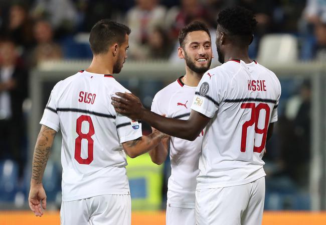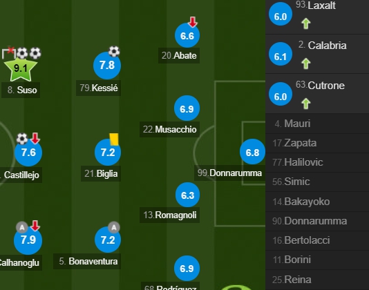 AC米兰(4-3-3):99-唐纳鲁马/20-阿巴特,22-穆萨基奥,13-罗马尼奥利,68-里卡多-罗德里格斯/79-凯西,21-比格利亚,5-博纳文图拉/8-苏索,7-卡斯蒂列霍(72'库特罗内),10-恰尔汉奥卢(77'拉索尔特)