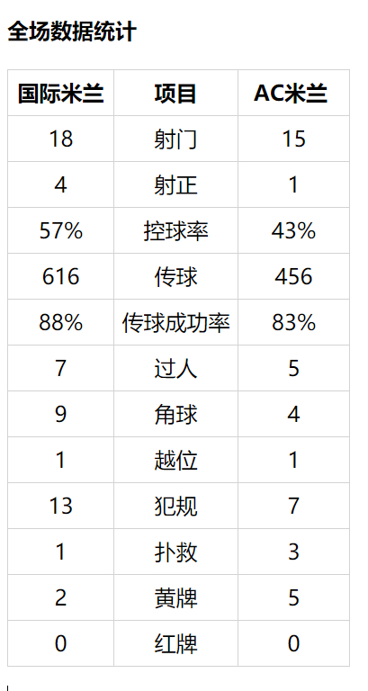 上半时AC米兰没有1次射正。下半时,伊卡尔迪禁区右侧抢断回做,贝西诺射门被挡,博尔哈-巴莱罗在门前12米处低射偏出近门柱。佩里希奇左路传中,波利塔诺后点反越位距门10米处凌空射门偏出左门柱。