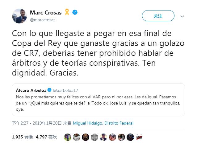 阿韦洛亚在推特上炮轰VAR,引来了巴萨球员的反击。前巴萨球星马克-克罗萨斯对此进行回击,“当年多亏了C罗的超级进球,你们赢下的国王杯决赛,而你在那场比赛中的表现。你应该禁止谈论裁判跟阴谋论。要点尊严,谢谢。”(那场比赛中,阿韦洛亚涉嫌踩踏比利亚)