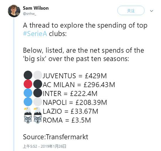 北京时间1月27日,TheLaziali.com编辑Sam Wilson统计了近十个赛季意甲排行前六的球队的净支出情况。2008-2009赛季至今,尤文图斯以4.29亿英镑的净支出位居第一位。