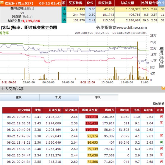 阿森纳在17:40附近成交量密集增加,大单频出,且从交易记录来判断大多是主动买入,赔率也相应下跌。