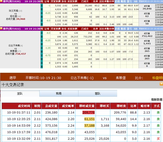 这场比赛的必发亚盘数据显示,成交量极大,与同一时间开赛的其它德甲相比,成交量10倍到20倍。明显异常。针对这样的亚盘异常情况,一般处理就是关注成交比例高的那一方。