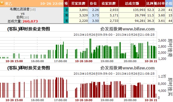 这场英乙赛事必发标盘成交量相对较大,达到26万,是同时举行的英乙联赛的数倍。主队必指不高,仅41,说明资金信心不足,同时挂单相对偏弱,且卖强买弱,缺乏波动性。而客队的必