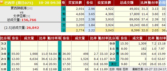 必发数据的比分页面最常见的用途就是判定胜负与大小球,累西腓这场赛事比分成交量相对较大,主要成交量都集中在大球区,并且大小球成交量也是大球成交比例高。
