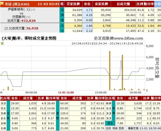 必发比分:负方早盘成交量均未过3位数,总比率小于10%,负的可能性极小。胜方成交明显较高,早早达到4位数,且集中在3:x这三个比分项上。并且3:1、3:0这两个比分项的价位压得相当低,值得看好。