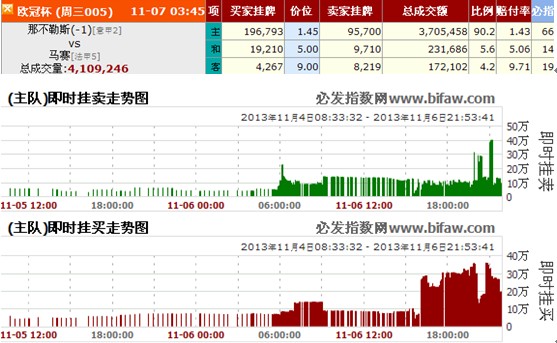 必发标盘显示主队成交比例90%,410万的成交量在今天的比赛中算是中等偏上,不能算是大热赛事。主队的必发挂单显示挂卖单相对活跃,尤其是21点附近挂卖曲线波动很大。这对主胜不是很有利。