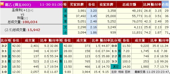 虽然大小球成交量不高,但小球的成交比例明显要高于大球,从固定比分来看,主客队的1:0成交量都相对较高,大球成交量3:2除外,都相对偏低。但3:2实在是一个小概率事件,不值得追捧。