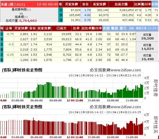 曼联成交比例较高,赔率略有波动,但没有明显的上行或下行的趋势。500万的成交量以主客队的名气来说,不算太高。从亚盘来看,主队一方不热,仅33%成交比例。也无大资金介入亚盘。从挂单来看,曼联的挂单明显比较活跃,客队挂买略强于挂卖,但缺乏成交量的支持。