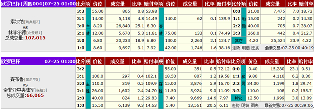 今天凌晨举行的多场欧霸杯赛事,以索尔纳与森布鲁这两场的波胆成交量最大,分别达到10万与6万。远超其它场次。