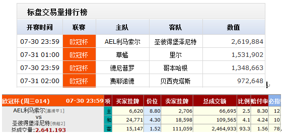 从必发指数网bifaw得到的成交量排行可以看到,今天成交量排名第一的是利马索尔这场比赛,成交量261万。对于成交量排名第一的比赛有个较为简单的处理模式:
